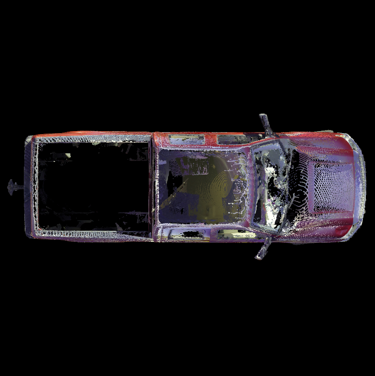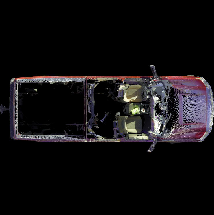 3D laser-scanned point cloud of a 2016 Ford F-250, including interior. Scan is an exemplar model with no/negligible damage in E57 file format.