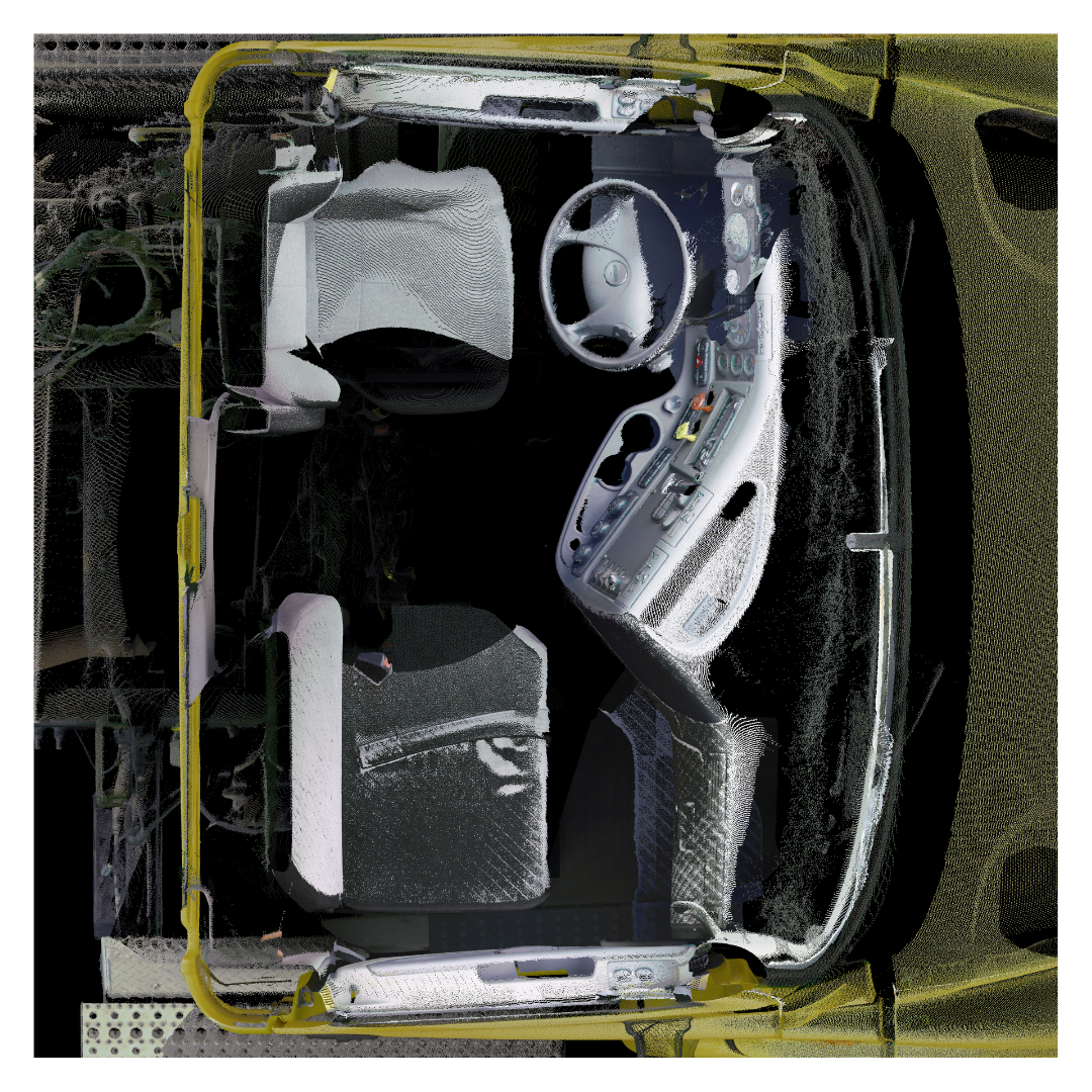 3D laser-scanned point cloud of a 2019 Freightliner Cascadia, including interior. Scan is an exemplar model with no/negligible damage in E57 file format.