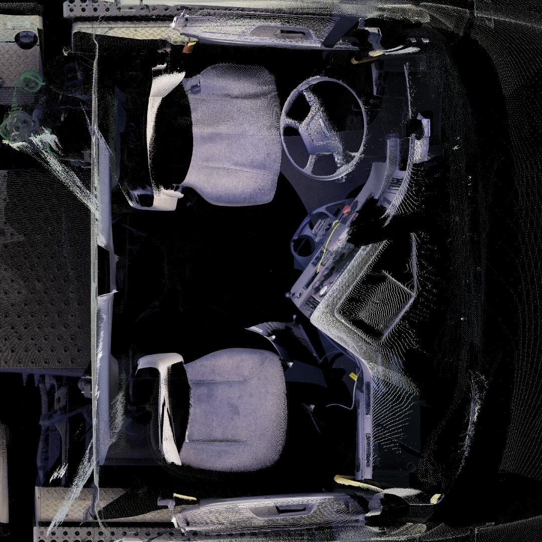 3D laser-scanned point cloud of a 2022 Freightliner Cascadia, including interior. Scan is an exemplar model with no/negligible damage in E57 file format.