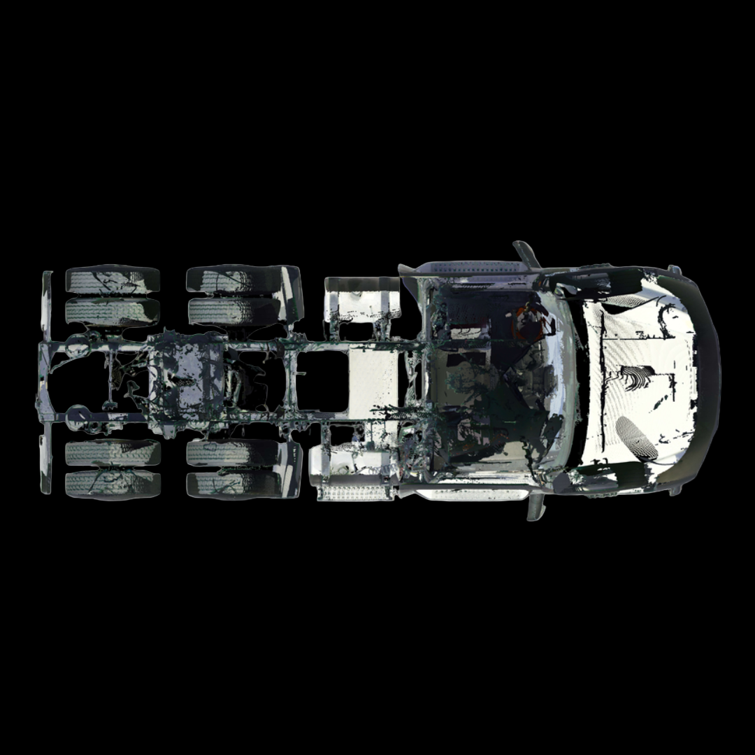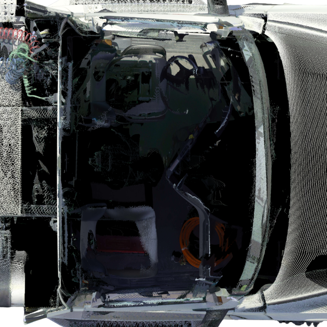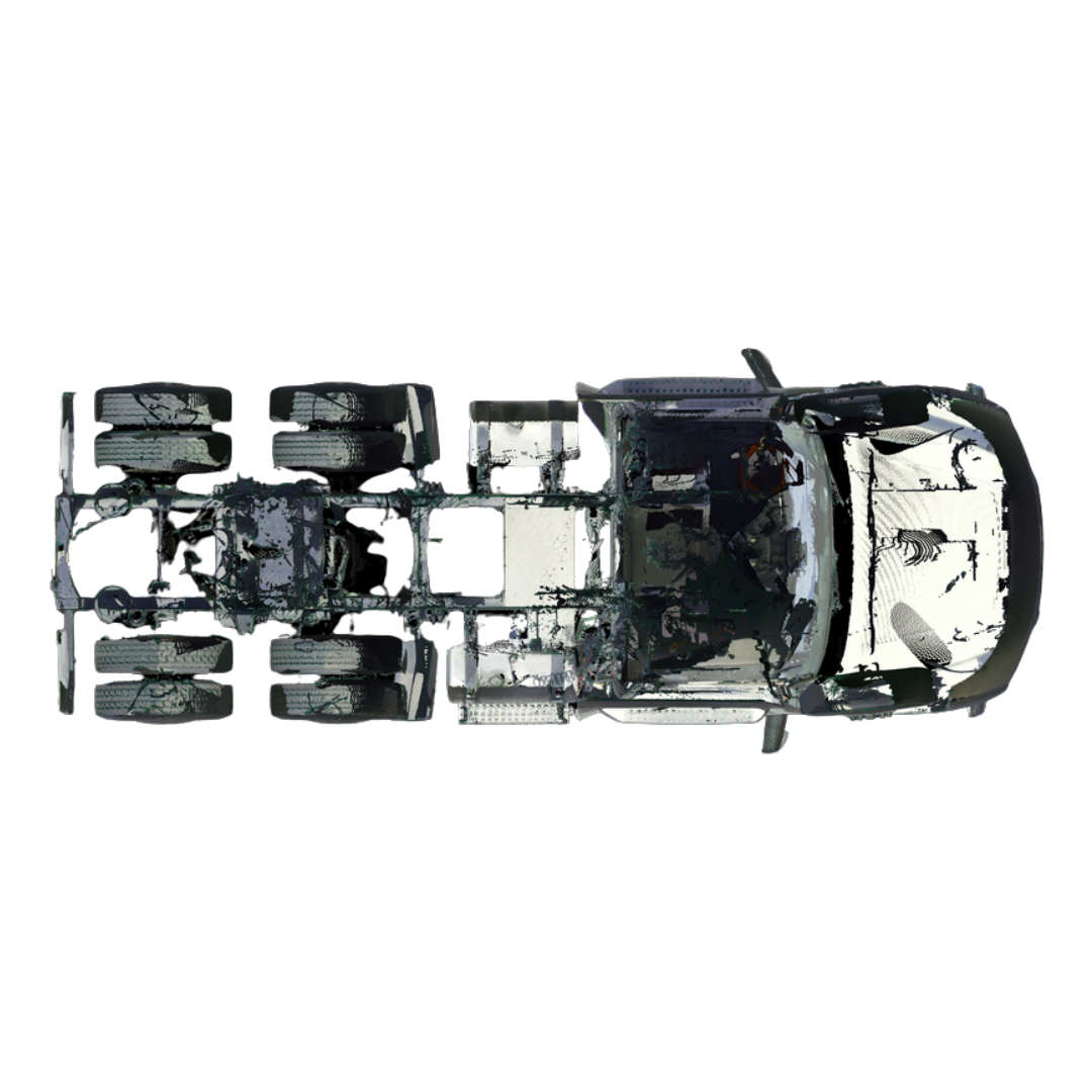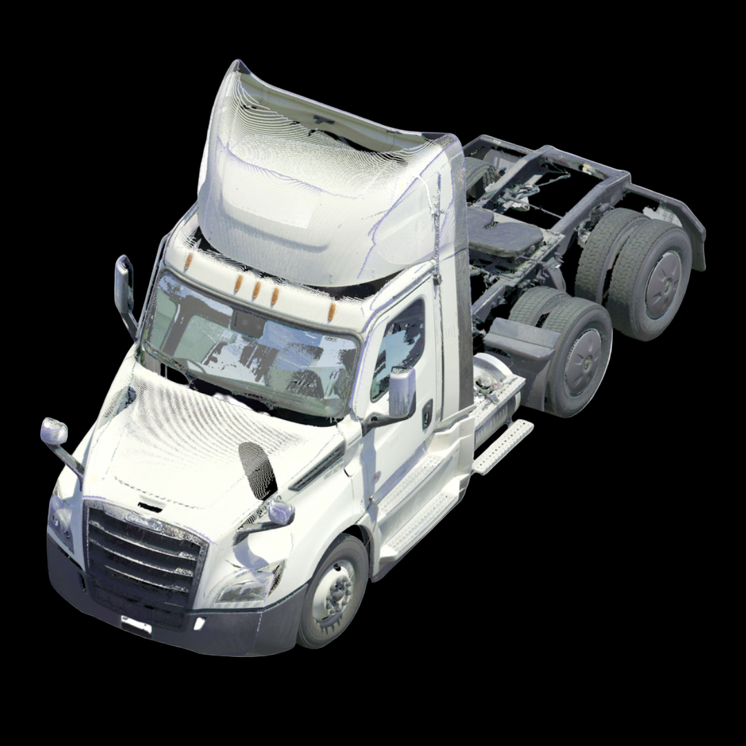 3D laser-scanned point cloud of a 2023 Freightliner Cascadia, including interior. Scan is an exemplar model with no/negligible damage in E57 file format.