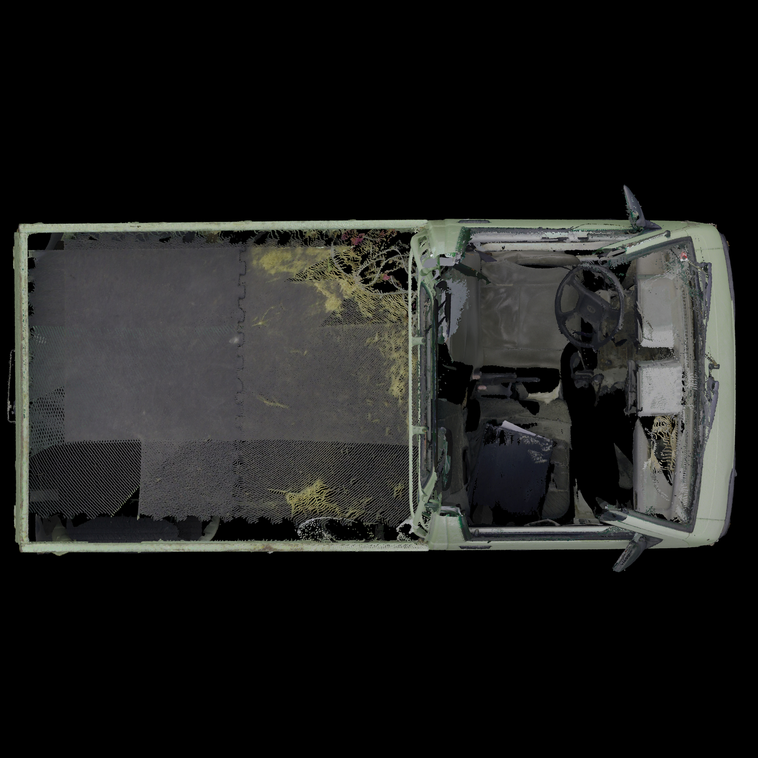 3D laser-scanned point cloud of a 2002 Kia GC Kei Truck, including interior. Scan is an exemplar model with no/negligible damage in E57 file format.