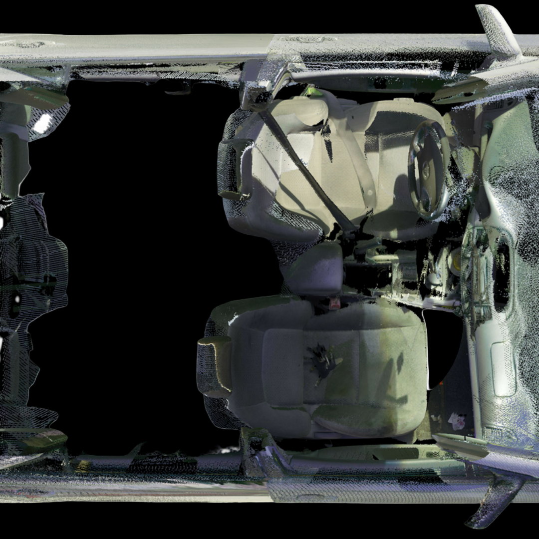 3D laser-scanned point cloud of a 2002 Toyota Camry, including interior. Scan is an exemplar model with no/negligible damage in E57 file format.